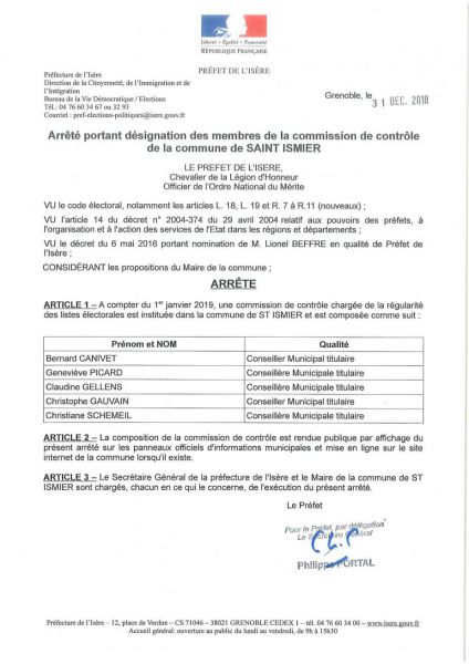 Veuillez trouver ci-après l’arrêté préfectoral portant désignation des membres de la commission de contrôle